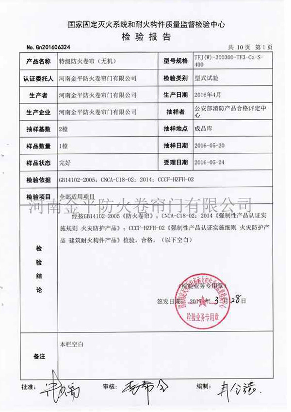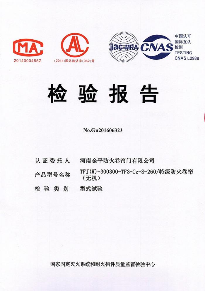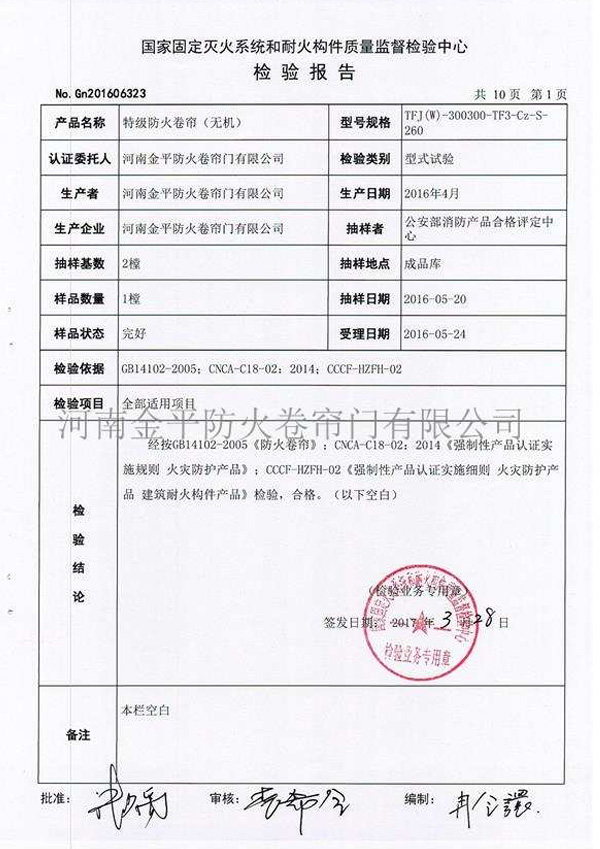 特(tè)級防火(huǒ)卷簾(無機)檢驗報告