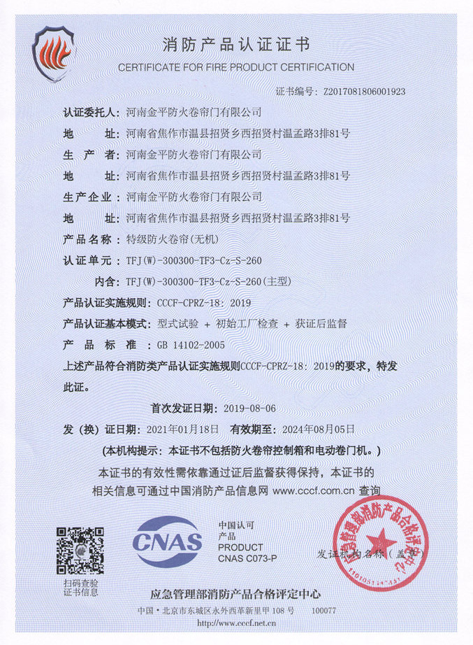 特級防火卷簾(折疊提升式)3C證書